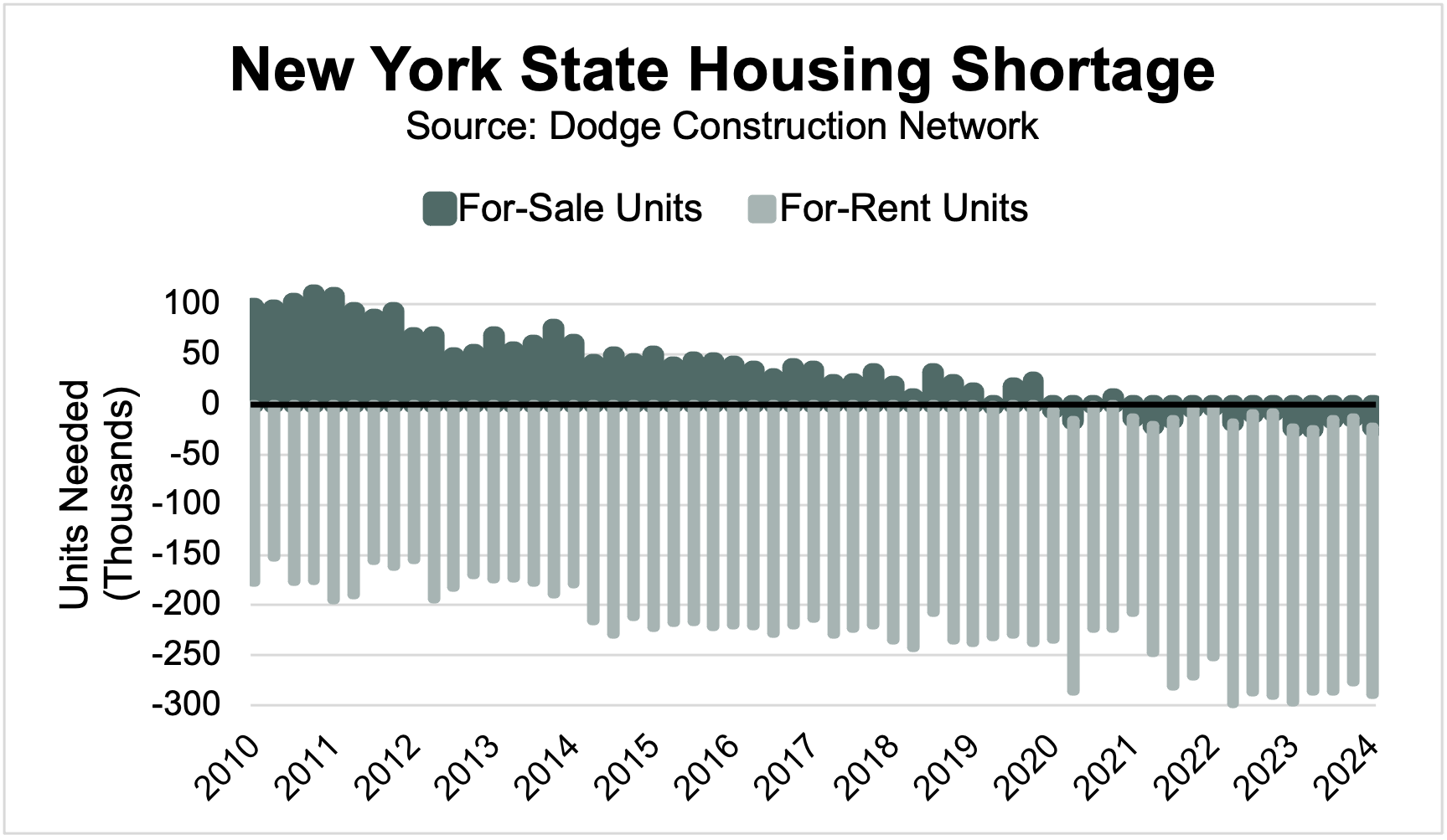 New York City’s housing market has faced its share of hurdles in recent years, leaving many to question where the largest apartment market in the country is headed. Indeed, New York state is currently facing a massive housing shortage. According to Dodge Construction Network estimates, the state’s housing deficit has hovered around 300,000 units since 2022, unable to return to its historically typical deficit of 191,000 units (between 1970 and 2019). To return to its long-run vacancy rate average, the state would need to add over 266,000 for-rent units and 23,000 for-sale units to the current stock. This analysis delves into the current state of New York’s housing market, examining recent trends and potential future developments that will shape the city’s residential landscape in 2024 and beyond.