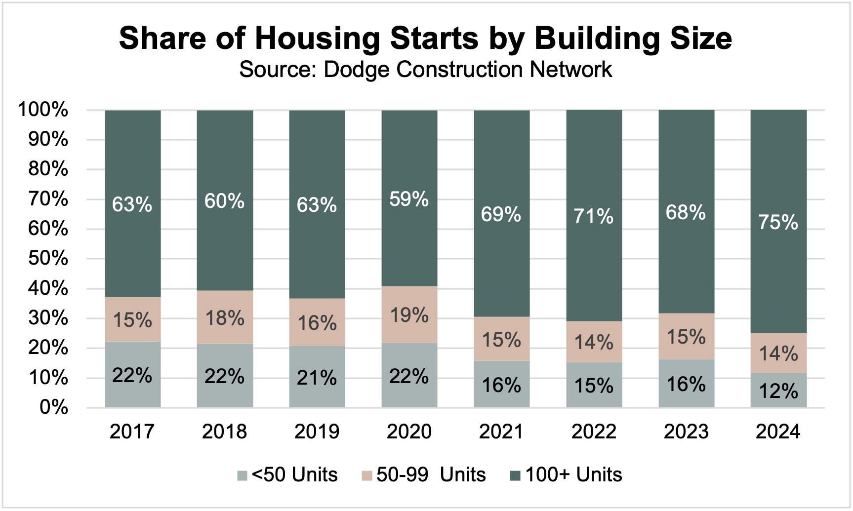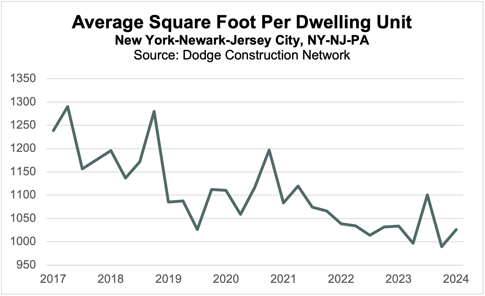 The rapid growth in prices has exacerbated the divide between higher and lower income households. Almost 70% of home sales in Manhattan were cash purchases in 2023Q4, up from 55% in 2022. (Chaffin 2024) Generally speaking, demand for more expensive units is driving more investment towards projects with over 100 units. According to Dodge Construction Network’s project database, 75% of total units that broke ground so far in the first four months of 2024 came from buildings with over 100 units, which is up 12% from 2017 levels. Moreover, the average square foot per dwelling unit (across all building sizes) has fallen 17% in comparison to 2017 levels – highlighting the prevalence of these higher-unit buildings that often have smaller units.
