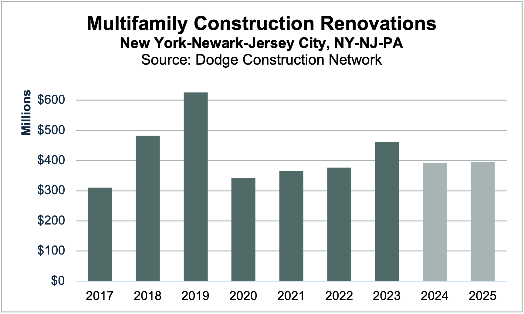 According to Dodge’s project database, three office-to-residential conversion projects have entered the planning stage as of April 2024. If they succeed in reaching groundbreaking, these three projects could add around 1,500 new apartment units to the market. Overall, it’s quite costly and technically difficult to convert office buildings to residential units – but new tax incentives could provide more opportunity in this segment of the market. The value of total apartment renovations is expected to fall 15% in 2024 before ticking up 1% in 2025, according to the most recent Dodge Construction Network forecast.