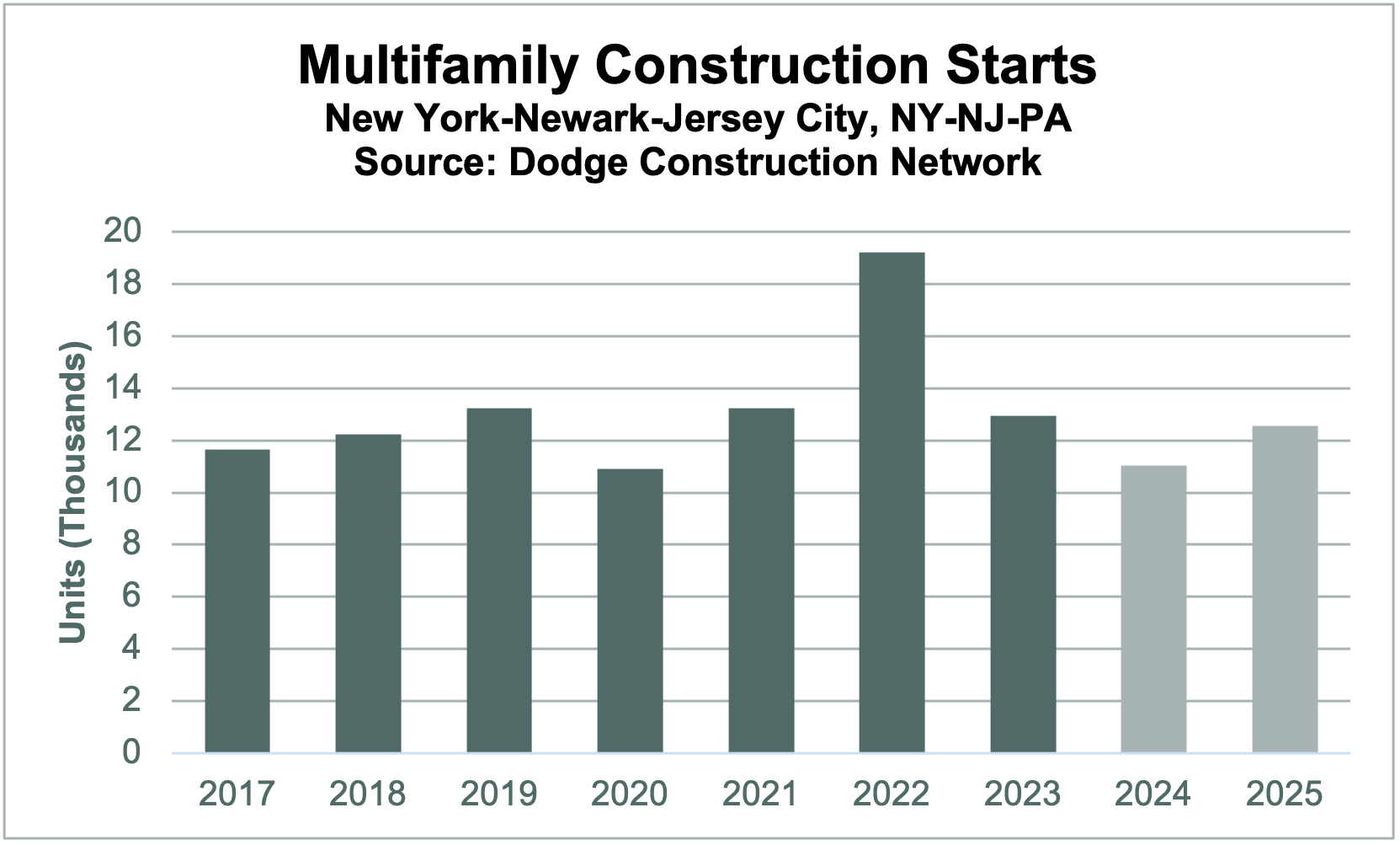 Much of the remaining renters in New York City live in rent-regulated apartments – which are subject to much stricter regulations on rent increases. While this has been critical for affordability, investors have shied away from these properties recently. As lenders tightened their standards throughout 2023, the value of these properties regressed 18% from peak levels. (Ariel Property Advisors 2024) The closure of Signature Bank last year, one of the largest lenders for rent-stabilized assets, limited financing options for owners and developers. Even as New York Community Bank (now the largest lender in the space) bought a large portion of Signature Bank’s assets, it reported $2.4 billion in losses on CRE loans in its fourth-quarter earnings report. (Rogers 2024) This has made it more difficult for investors to find financing and stay in the market. According to Dodge data, multifamily construction starts in the New York metro area expanded 45% in 2022 but fell back 33% in 2023 alongside those rising interest rates and tightening lending standards.