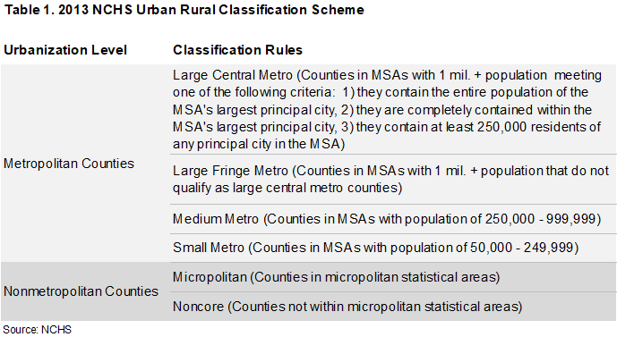 To assess whether retail building starts have lately been expanding faster in areas away from dense urban cores, this article made use of the urban–rural classification method developed by the National Center for Health Statistics (NCHS) in 2013. That classification, which can be seen from Table 1, groups counties from the most urban to the most rural (of note: large central metros are akin to inner cities and large fringe metros are akin to suburbs).