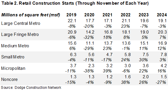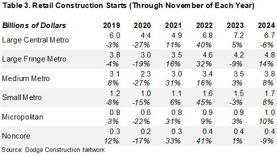 Table 3 shows changes in the dollar value of retail construction starts. Dollar value mirrored the same pattern seen for square footage during and immediately after the pandemic, with value rising in double digits in 2021-22. Following the strong advances, value rose more modestly in 2023-24. Except for large central metros and noncore nonmetro areas, the dollar value of starts increased between 2024 and 2022 in all metro and nonmetro locations.