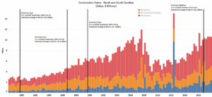 Infrastructure construction on the other hand, may be quicker to materialize due to extensive flooding in the affected area. Public works construction was 19% higher year-to-date through August in North and South Carolina, with activity likely to remain elevated in the coming quarters. Again, however, the speed of this hurricane construction will be largely determined by the pace of federal disaster assistance. A report by the Congressional Budget Office found that relief funds related to Superstorm Sandy were distributed very slowly. Even in 2018, Dodge Data & Analytics continued to record projects related to the 2012 storm.