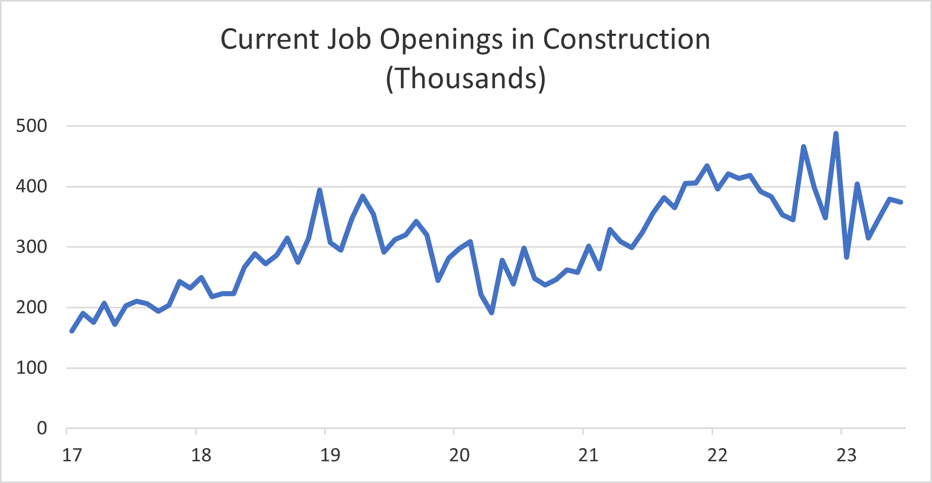 The Job Openings and Labor Turnover Survey published by The Bureau of Labor Statistics estimates that the number of US Job openings fell to a seasonally adjusted 9.58 Million in June. This represents a -0.4% decline from May’s revised estimate of 9.62 Million. Though a much smaller decrease than last month’s nearly 7% drop in openings, this marks the second consecutive month of decline in total US job openings. This should be music to the ears of the Federal Reserve, tasked with cooling off the US economy to combat inflation. The construction labor market posted a similarly small decline of 1% in openings from May’s revised measure of 379,000 openings to 374,000 in June.