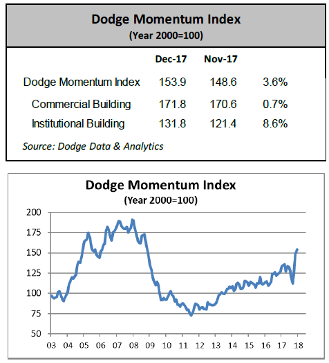 NEW YORK – January 8, 2018 – The Dodge Momentum Index grew 3.6% in December to 153.9 (2000=100) from the revised November reading of 148.6. The Momentum Index is a monthly measure of the first (or initial) report for nonresidential building projects in planning, which have been shown to lead construction spending for nonresidential buildings by a full year. December’s increase was due to an 8.6% jump in the institutional component of the Momentum Index, while the commercial component eked out a 0.7% gain. For the full year 2017, the Momentum Index averaged 132.3, up 10.7% from the full year average for 2016, with similar improvement for the commercial sector (up 11.4%) and the institutional sector (up 9.7%). After retreating during the third quarter of 2017, the Momentum Index regained its upward track in the fourth quarter, which enabled December’s reading for the Momentum Index to be up 20.9% compared to the same month a year ago. The continued strengthening by the Momentum Index in 2017 suggests that nonresidential building construction activity will advance further during 2018.