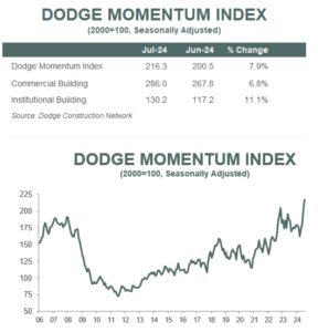 BEDFORD, M.A. – August 7, 2024 — The Dodge Momentum Index (DMI), issued by Dodge Construction Network, increased 7.9% in July to 216.3 (2000=100) from the revised June reading of 200.5. Over the month, commercial planning increased by 6.8%, and institutional planning expanded by 11.1%.