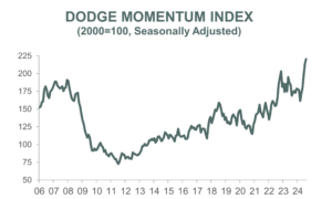 BEDFORD, M.A. – September 9, 2024 — The Dodge Momentum Index (DMI), issued by Dodge Construction Network, increased 2.9% in August to 220.4 (2000=100) from the revised July reading of 214.2. Over the month, commercial planning expanded 1.9% and institutional planning improved 5.7%.