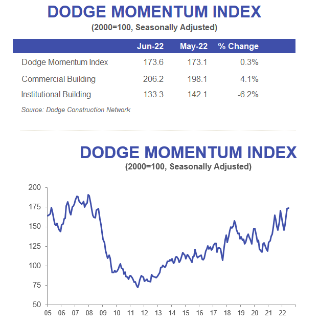 Commercial planning in June was led by an increase in warehouse projects, while most other commercial buildings were flat. For institutional planning, a decrease in education projects in June dragged the sector lower, although healthcare increased. On a year-over-year basis, the Momentum Index was 9% higher than in June 2021. The commercial component was 11% higher, and the institutional component was 5% higher than one year ago.
