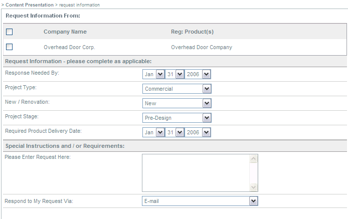 You can find the RFI tab located under the Company navigation. You can request for information from the company about a particular product or a list of products or any sort of information relating the company and the construction industry.