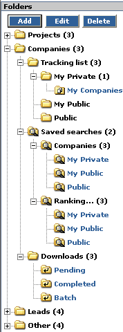 Tracking list: Contains lists of companies that you have chosen to track. You may also create your own Tracking Lists. These folders store the company information you wish to manage. Saved Searches: Displays information related to your saved company searches, as well as your saved ranking searches. Downloads: Sub-folders may include Pending, Completed and Batch. The folders store and manage company download information.