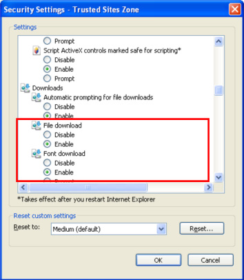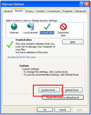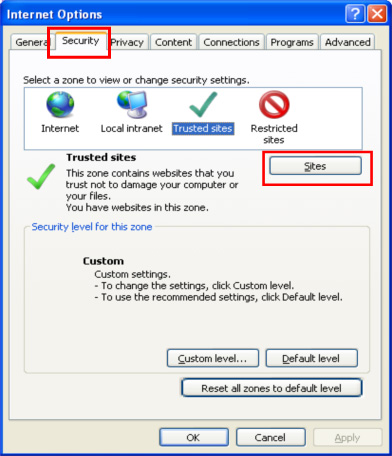Select the Security Tab, then click Trusted sites and click the Sites button