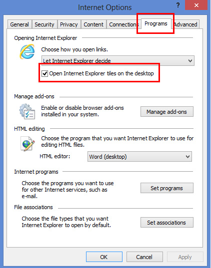 Windows 8 users please note: in order to use our website on this platform, you must run the 32 bit version of Internet Explorer from the desktop (not the “tile” screen.) For your convenience, you can make the change below which will always run the desktop version of Internet Explorer, even when launching it from the “tile” Screen.