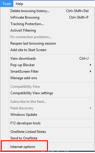 Launch Internet Explorer and select Tools | Internet Options (depending on your version of Internet Explorer, your menu will look like one of the two screen shots below)