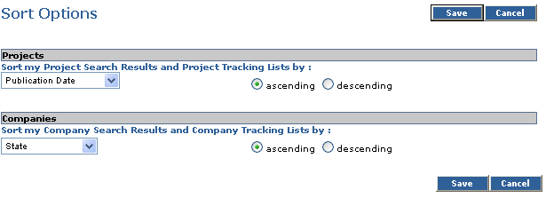 The Sort Options page allows you to choose how your Project and Companies search results display by choosing the field you wish to sort by.