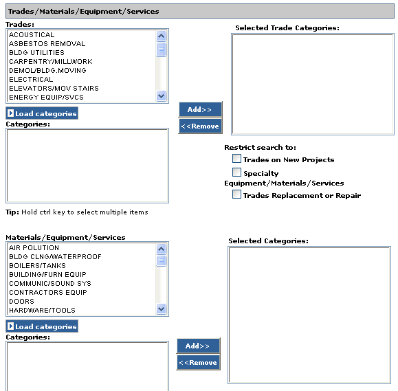 - To search specific Categories within the selected Materials/Equipment/Services, click Load categories.
