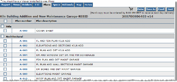 Once at the Plan Viewer, you will see a listing of all available plans for the project. You can immediately access a drawing by clicking on the drawing number.