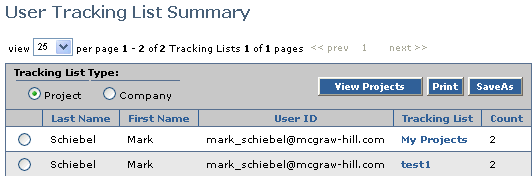 - Select Project view project tracking lists, or Company to view company tracking lists.