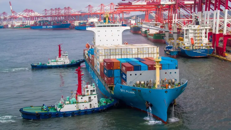 (A container ship berthing at the port in Qingdao, in China’s eastern Shandong province.)