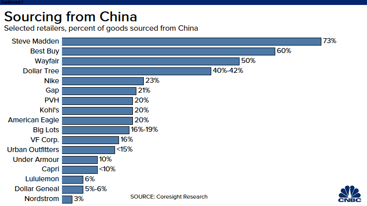 Shoemaker Steve Madden, with some of the biggest exposure, has said about 73% of its goods are sourced from China. For Best Buy, it is 60%. For online furniture company Wayfair, it is about 50% of goods. Each American Eagle, Kohl’s and Calvin Klein owner PVH source about 20% of goods from China.