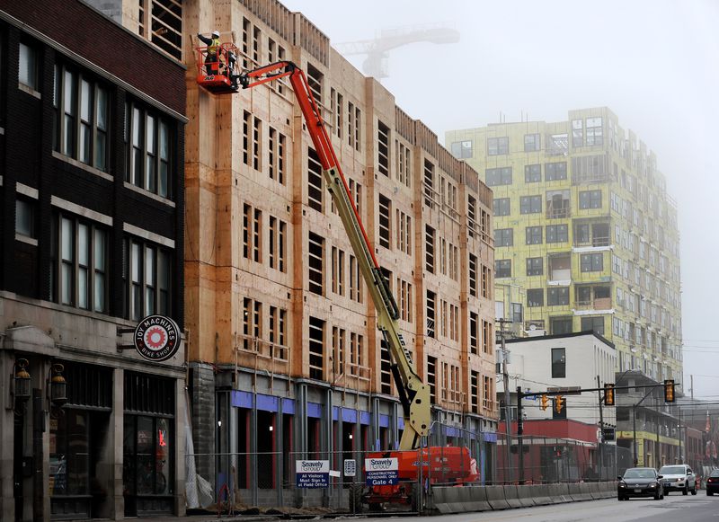 Construction continued Monday at apartment projects in Cleveland’s Ohio City neighborhood. Contractors are grappling with rising absenteeism as workers call in sick or choose to stay home out of fear of catching, or spreading, the coronavirus.
