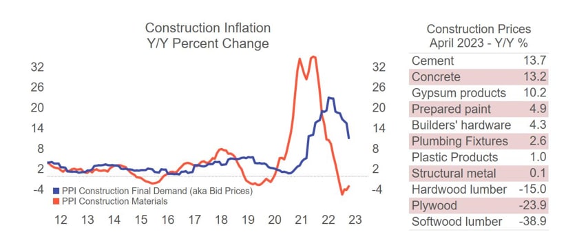 This increase could impact the construction industry, which heavily relies on raw materials and supplies. The red line on the graph, which represents the year-over-year percent change in a composite index of construction materials, has seen an upturn, which could be concerning as it leads the bid price, represented by the blue line, by 12 months; if sustained, this could potentially lead to a re-acceleration in bid prices in 2024, just as building markets are expected to improve following the slowdown in 2023. As we navigate these uncertain times, construction firms must remain vigilant and adapt to evolving market conditions by closely monitoring their costs and adjusting their pricing strategies to stay competitive. Let’s continue to keep an eye on key indicators like the PPI to make informed decisions for our business and clients. Stay tuned for more updates and insights.