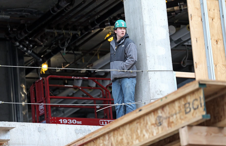 BOSTON, MA. – MARCH 17: A construction worker at a site in the Seaport District peers out of a opening. Mayor Marty Walsh ordered all construction to stop today as the Coronavirus continues to spread on March 17, 2020 in Boston, Massachusetts. (Staff Photo By Matt Stone/MediaNews Group/Boston Herald)