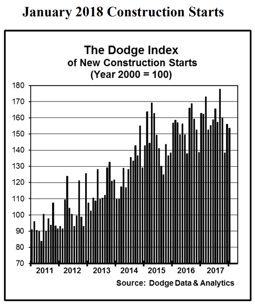 The January statistics produced a reading of 154 for the Dodge Index (2000=100), compared to December’s upwardly revised 156. During 2017, the pattern of construction starts frequently showed an up-and-down pattern, which was present towards the end of last year when the Dodge Index fell to 138 in November followed by 156 in December. The 154 reading for the Dodge Index in January, along with December’s 156, shows construction starts climbing back close to last year’s mid-range of activity. For 2017 as a whole, the Dodge Index averaged 159.