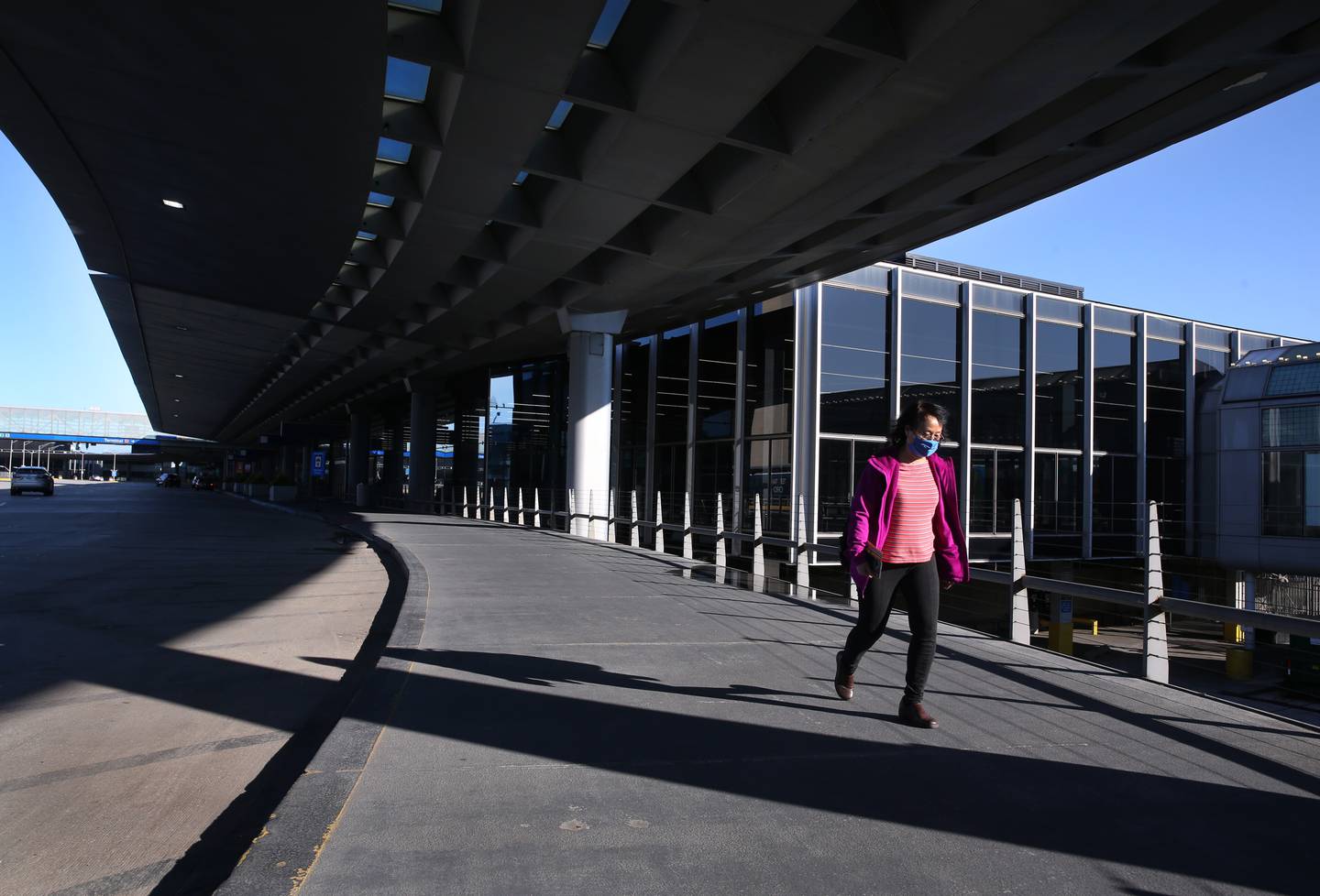 A person takes a stroll April 30, 2020, outside the Terminal 2 building at Chicago’s O’Hare International Airport. (Chris Sweda/Chicago Tribune)