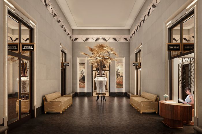 Under-construction mega-tower at 111 West 57th Street still has hundreds of millions of dollars in listings still on the market. A rendering of the lobby.