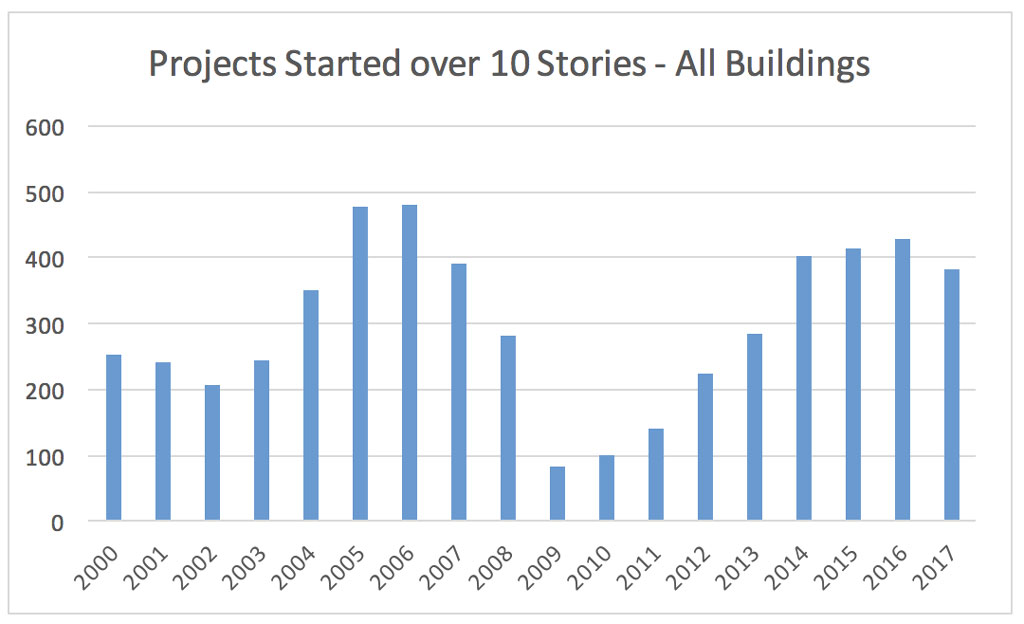 High rise construction of buildings greater than 10 stories is one of the most cyclical segments of the U.S. construction market. During a recession the volume of these high rise buildings can fall to virtually nothing, and in strong markets it can rebound significantly, as seen in the infographic below. You can see that high rise construction was strongest in the few years before the 2008 recession, but has rebounded well in the years following the recession.