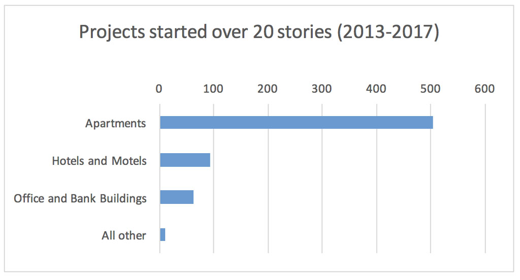 Additionally, the very super high rise building category (high rise buildings with 20 or more stories) is dominated by just three building categories, apartments, hotels and motels, and finally, office and bank buildings.