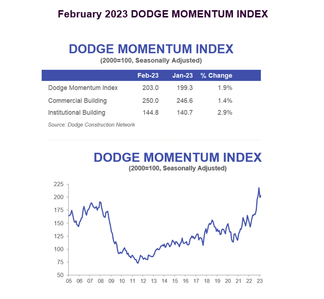 HAMILTON, N.J. – March 7, 2023 — The Dodge Momentum Index (DMI), issued by Dodge Construction Network, advanced 1.9% in February to 203.0 (2000=100) from the revised January reading of 199.3. In February, the commercial component of the DMI rose 1.4%, and the institutional component increased 2.9%.