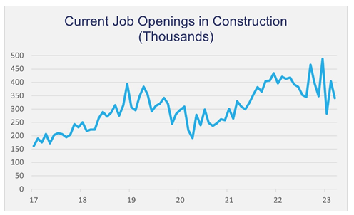 U.S. job openings as recorded by the Bureau of Labor Statistics fell to 9.6 million in March, the lowest level since April of 2021. This marks the third consecutive month of decline and points to ongoing success in the cooling of the labor market. The construction sector faced similar declines with the number of openings in the industry falling from 404,000 in February to 341,000 in March.