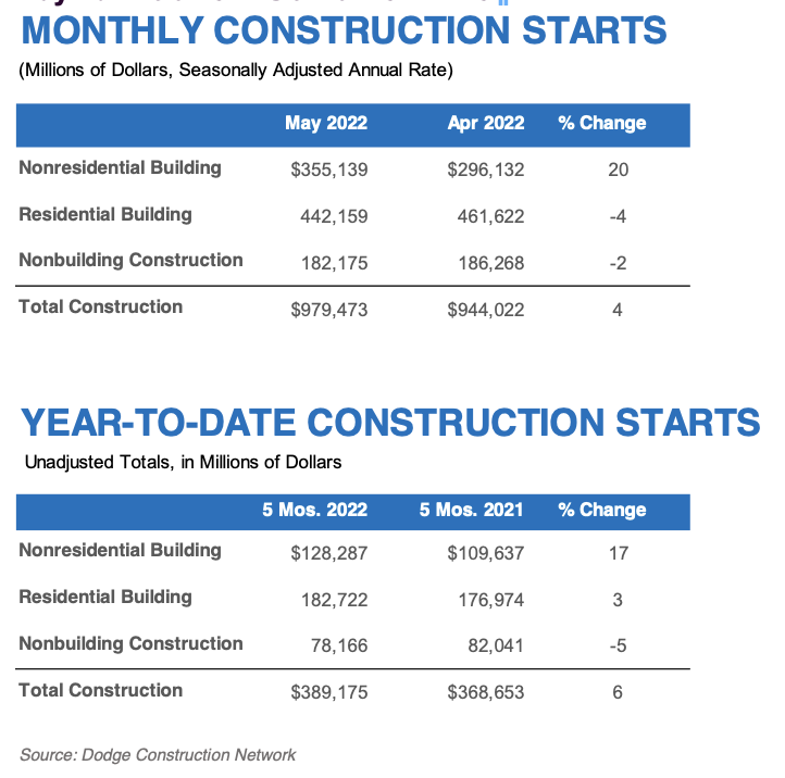 Total construction starts rose 4% in May to a seasonally adjusted annual rate of $979.5 billion, according to Dodge Construction Network. Nonresidential building starts rose 20%, while residential starts fell by 4% and nonbuilding lost 2% during the month.