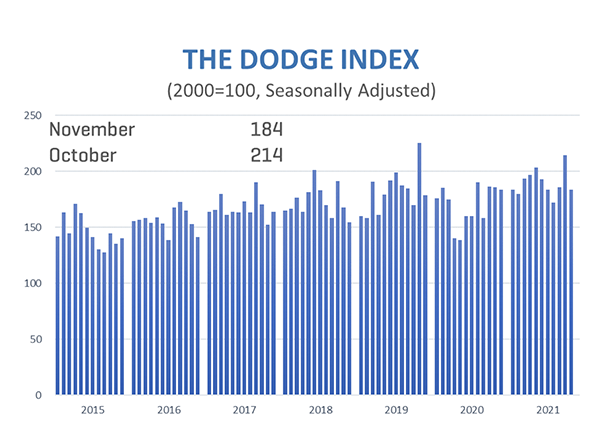 The largest nonresidential building projects to break ground in November were the $2.6 billion first phase of the Terminal 1 replacement at San Diego International Airport in San Diego, CA, the $840 million Robley Rex VA Medical Center Campus in Louisville, KY, and the $419 million expansion of the Wisconsin Convention Center in Milwaukee, WI. - Residential building starts rose 3% in November to a seasonally adjusted annual rate of $398.6 billion. Multifamily starts moved 16% higher, while single family starts slipped 2%. Through the first 11 months of 2021, residential starts were up 20% over the same period one year ago. Single family starts gained 20%, and multifamily start rose 23%.