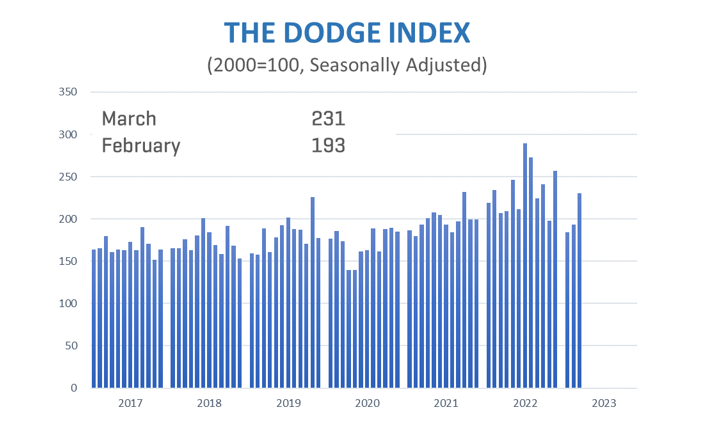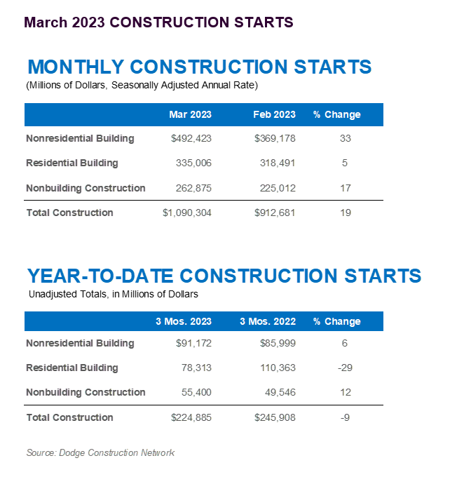 HAMILTON, NJ —April 20, 2023 — Total construction starts increased 19% in March to a seasonally adjusted annual rate of $1.09 trillion, according to Dodge Construction Network. During the month, nonresidential starts rose 33%, nonbuilding starts increased 17%, and residential starts moved 5% higher.