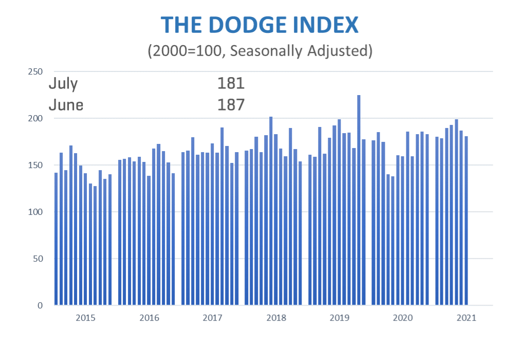 “Construction material prices continue their march higher and are weighing heavily on construction starts,” stated Richard Branch, Chief Economist for Dodge Data & Analytics. “Lumber and copper prices have fallen in recent weeks; however, steel, plastic and other construction-related products are continuing their ascent. These increases will continue to impact construction starts over the coming months, somewhat muting the impact of stronger economic activity. A further risk to the sector is the rising number of COVID-19 cases due to the Delta variant. While we don’t expect significant business restrictions in response, it is a risk that can not be fully discounted. On the upside, projects entering the planning stage remain at levels not seen in several years and forward progress on an infrastructure program and the federal budget provides hope that brighter days are ahead.”