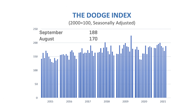 “Construction starts have struggled over the last three months as concerns over rising prices, shortages of materials, and scarce labor led to declines in activity,” stated Richard Branch, Chief Economist for Dodge Construction Network. “The increase in September, however, partially allays the fear that construction is headed for a free-fall and shows that owners and developers are still ready to move ahead with projects. Starts are likely to continue to trend in a positive but sawtooth fashion in the coming months until a more balanced recovery takes hold next year.”