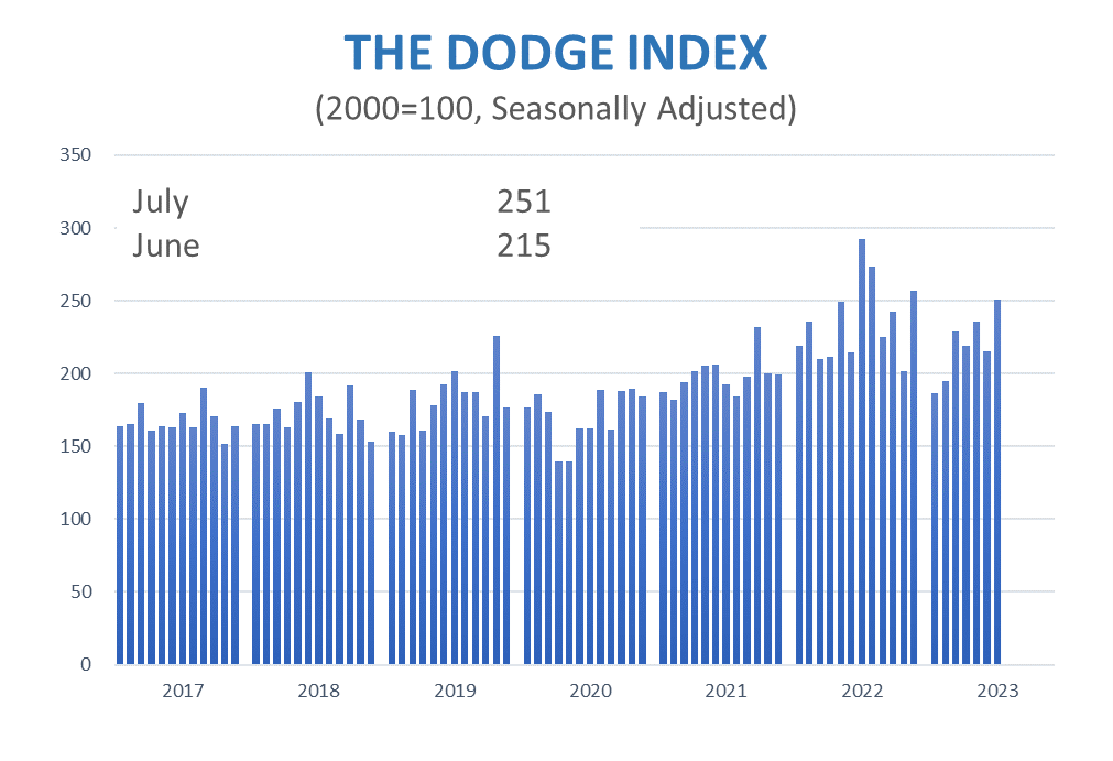 HAMILTON, NJ —August 16, 2023 — Total construction starts rose 17% in July to a seasonally adjusted annual rate of $1.2 trillion, according to Dodge Construction Network. Nonbuilding starts drove the increase, rising 38%, due to the start of a singular large LNG facility. Residential starts rose 20%, while nonresidential building starts lost 6%.